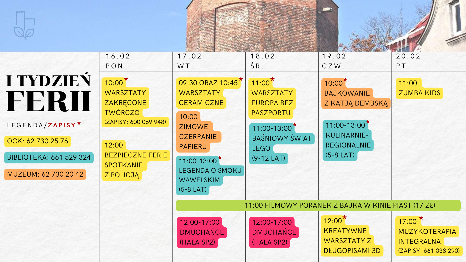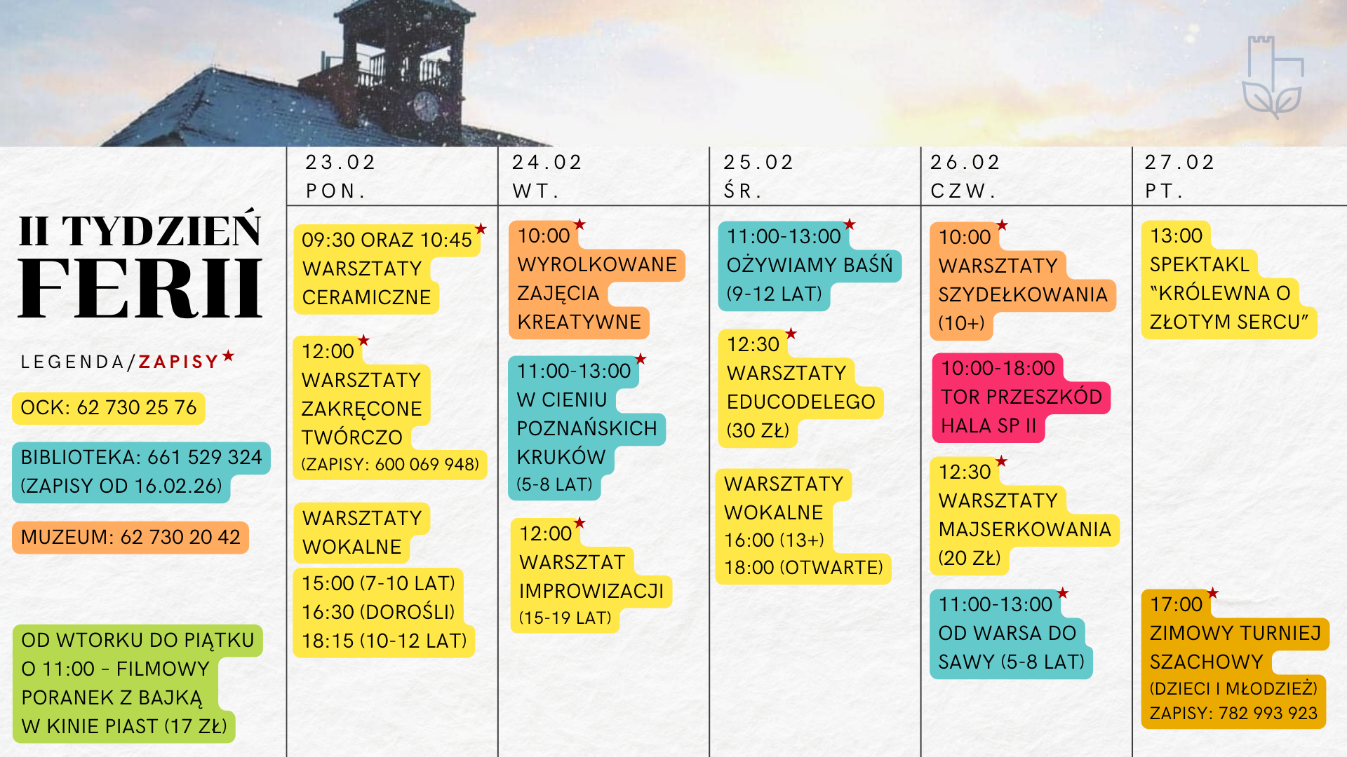 Zbieramy wszystkie zimowe propozycje, aby spiąć je w jeden kalendarz wydarzeń, zajęć i warsztatów. Poniżej znajdziecie państwo aktualną, graficzną rozpiskę programu na pierwszy oraz drugi tydzień Ferii. Serdecznie zachęcamy do udziału!