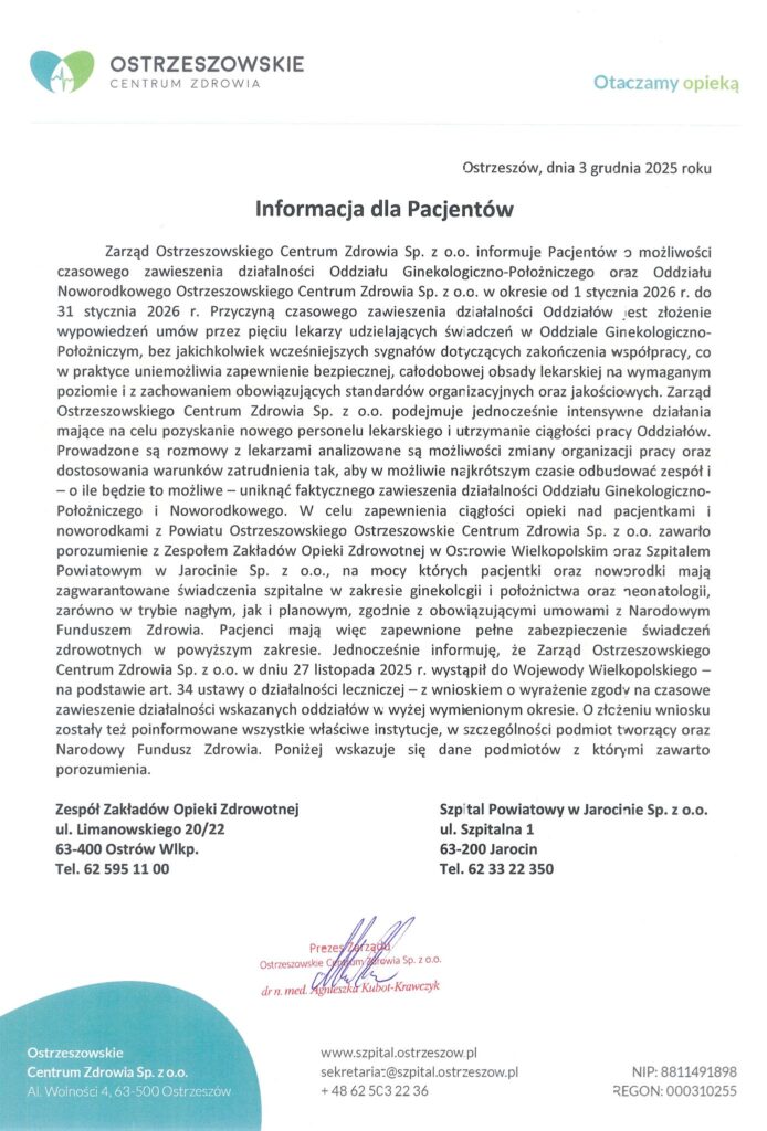 Z Oddziału Ginekologiczno-Położniczego Ostrzeszowskiego Centrum Zdrowia napływają alarmujące informacje. Jak ustaliliśmy, wypowiedzenia złożyło pięciu lekarzy, w tym kierownik oraz jego zastępca. Pojawia się więc pytanie, czy dojdzie do czasowego zawieszenia działalności oddziału? W tej sprawie oświadczenie wydała prezes spółki Agnieszka Kubot-Krawczyk. Poniżej przedstawiamy jego treść: