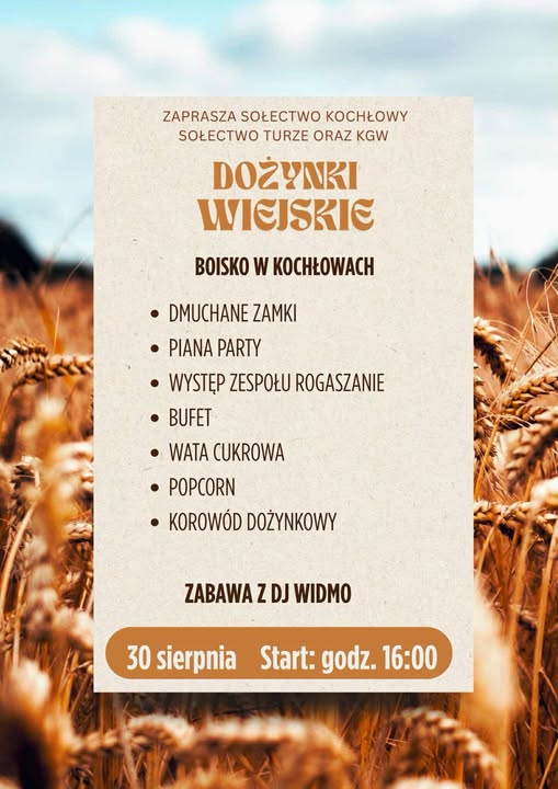 W najbliższą sobotę, 30 sierpnia, odbędą się: Festyn dożynkowy w Rojowie, Dożynki wiejskie w Siedlikowie, Dożynki wiejskie w Kochłowach oraz Pożegnanie lata w Szklarce Przygodzickiej.