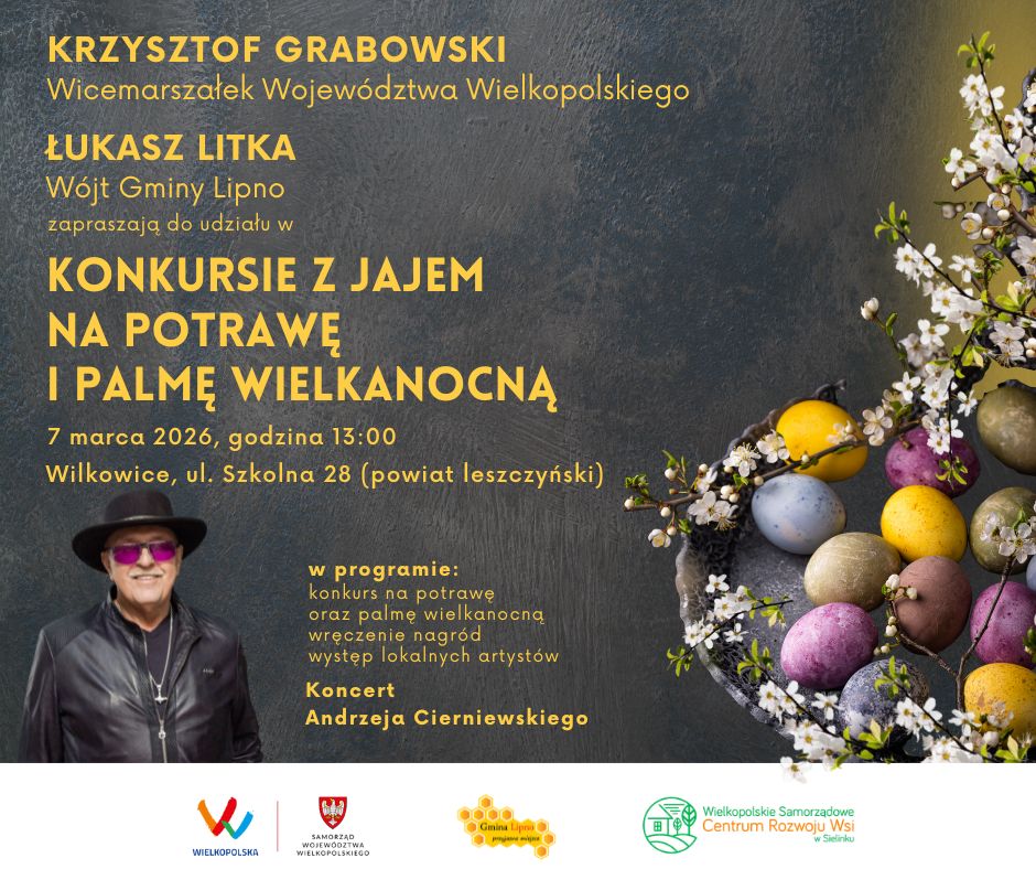 Wicemarszałek Województwa Wielkopolskiego Krzysztof Grabowski oraz Wójt Gminy Lipno Łukasz Litka zapraszają mieszkańców regionu do udziału w wyjątkowym wydarzeniu – Konkursie z Jajem na Potrawę i Palmę Wielkanocną, który odbędzie się 7 marca 2026 roku o godzinie 13:00 w Hali Sportowej przy ul. Szkolnej 28 w Wilkowicach (powiat leszczyński).