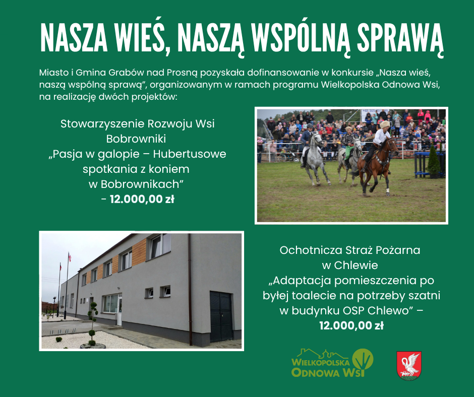Miasto i Gmina Grabów nad Prosną pozyskała dofinansowanie w konkursie „Nasza wieś, naszą wspólną sprawą”, organizowanym w ramach programu Wielkopolska Odnowa Wsi, na realizację dwóch projektów: