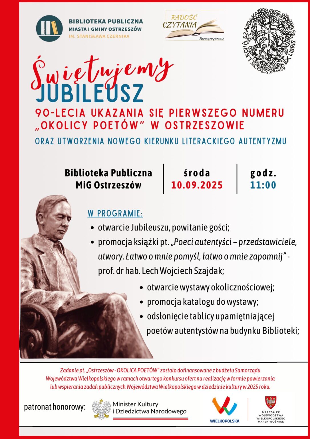 Serdecznie zapraszamy na wyjątkowe wydarzenie organizowane przez Bibliotekę Publiczną Miasta i Gminy Ostrzeszów im. Stanisława Czernika – obchody 90-lecia ukazania się pierwszego numeru „Okolicy Poetów” w Ostrzeszowie oraz utworzenia nowego kierunku literackiego – autentyzmu.