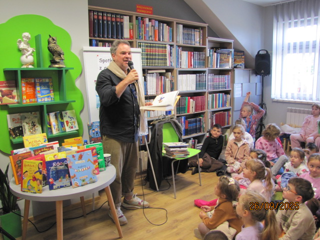Pierwszym pisarzem, który odwiedził bibliotekę w Czajkowie był Grzegorz Kasdepke, spotkał się on z uczniami kl. 1-3 i klasą integracyjną. O sobie mówi, że jest gadułą i bardzo lubi spotkania z dziećmi, bo zawsze jest ciekawie, zaskakująco i wesoło. Tak też było w bibliotece w Czajkowie, szczególnie w momencie zadawania niestandardowych pytań od czytelników. “Wiercić komuś dziurę w brzuchu”, “Chodzić spać z kurami”, “Być na świeczniku”, “Zbijać bąki”, “Znać się ja łyse konie”, “Wpaść komuś w oko” – te i inne związki frazeologiczne w niezwykle klarowny sposób wyjaśniał pisarz. Jego książki “Co to znaczy…”, “Detektyw Pozytywka” i wiele, wiele innych bawią i uczą, czyta się je fantastycznie, nie sposób się przy nich nie śmiać i radować.