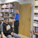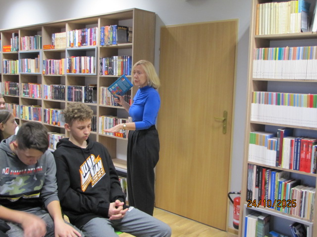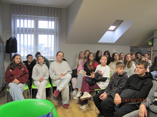 Kolejną autorką była Ewa Nowak. “Lubię świat ludzi młodych, lubię wracać do tego momentu w życiu, do nastoletnich lat, kiedy chodziłam do szkoły” – tak o sobie mówiła, nasz gość Ewa Nowak na spotkaniu autorskim. Z zawodu jest pedagogiem-terapeutą, książki dla młodzieży pisze od dwudziestu lat. W swoich książkach pisze o trudnych relacjach, przyjaźni, miłości, “tematy pisane sercem, coś co mogę dać światu”(cytat autorki). Powieści “Bardzo biała wrona” oraz “Orkan. Depresja” zostały uhonorowane tytułem Książka Roku Polskiej Sekcji IBBY.Na spotkanie dotarli uczniowie z kl. 7 z Wróblewa, z woj.łódzkiego wraz z zaprzyjaźnioną nauczycielką i bibliotekarką Justyną Bielecką. Uczniowie z kl. 7 i 8 z naszej szkoły podstawowej wraz z nauczycielami Anną Nowak, Moniką Kurek-Pacyna, Dorotą Jangas uczestniczyli w tak ciekawym i fascynującym wydarzeniu.