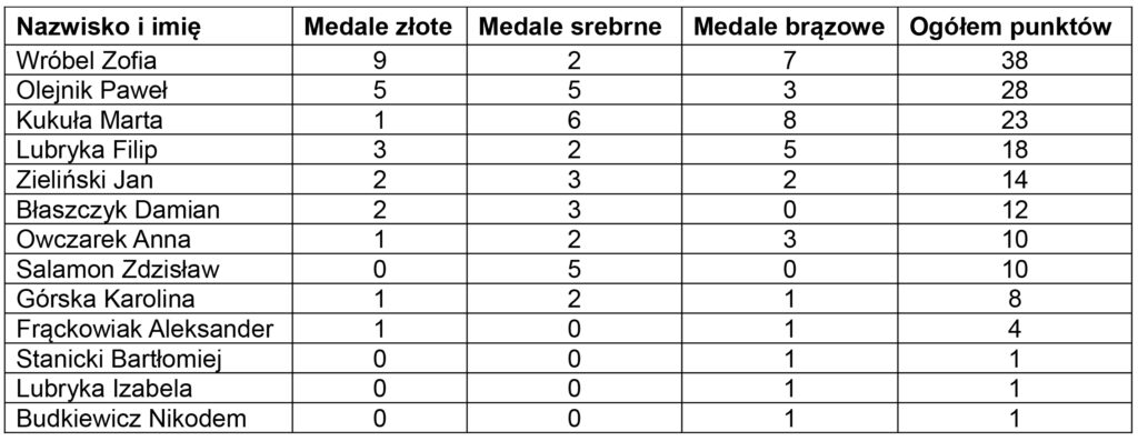 Aby łatwiej ocenić dorobek naszych zawodników przyjęliśmy następującą punktację: za złoty medal -3 punkty, za srebro – 2 punkty i za brąz – 1 punkt.