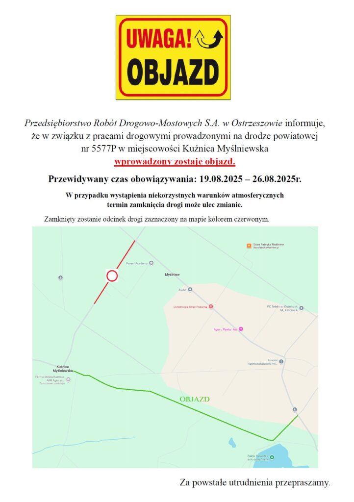 Uwaga, objazd w Kuźnicy Myślniewskiej!