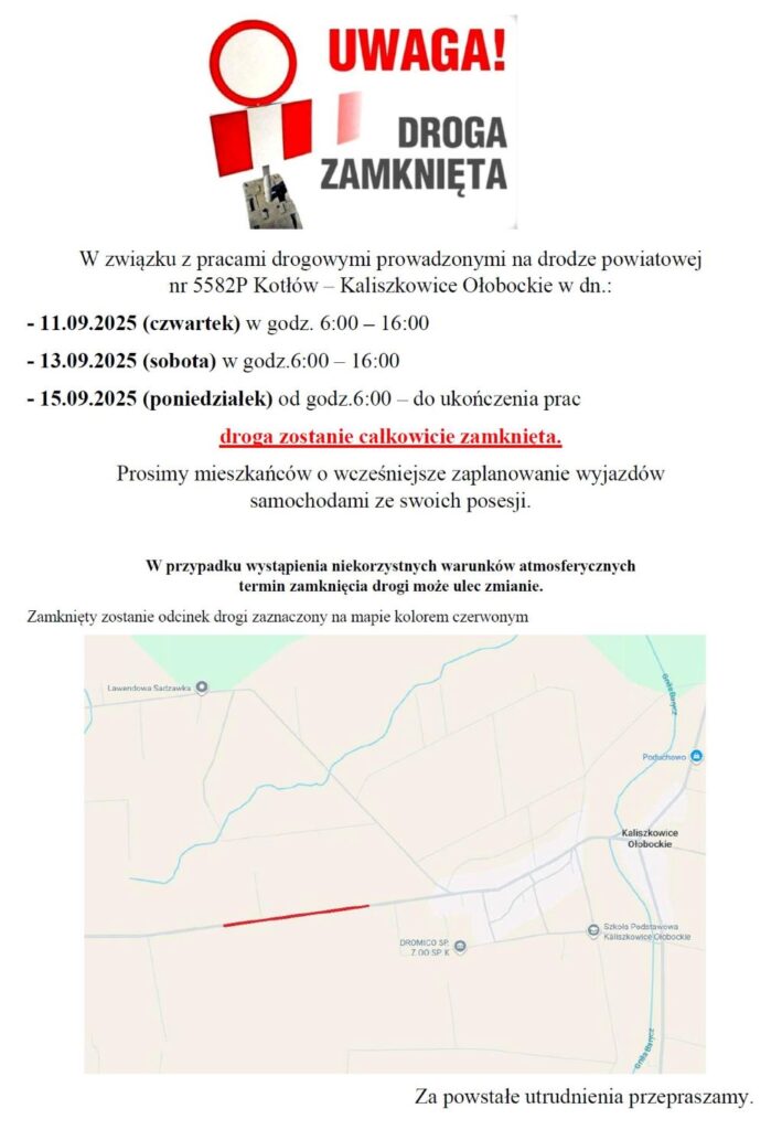 Uwaga, zamknięcie drogi Kotłów–Kaliszkowice Ołobockie