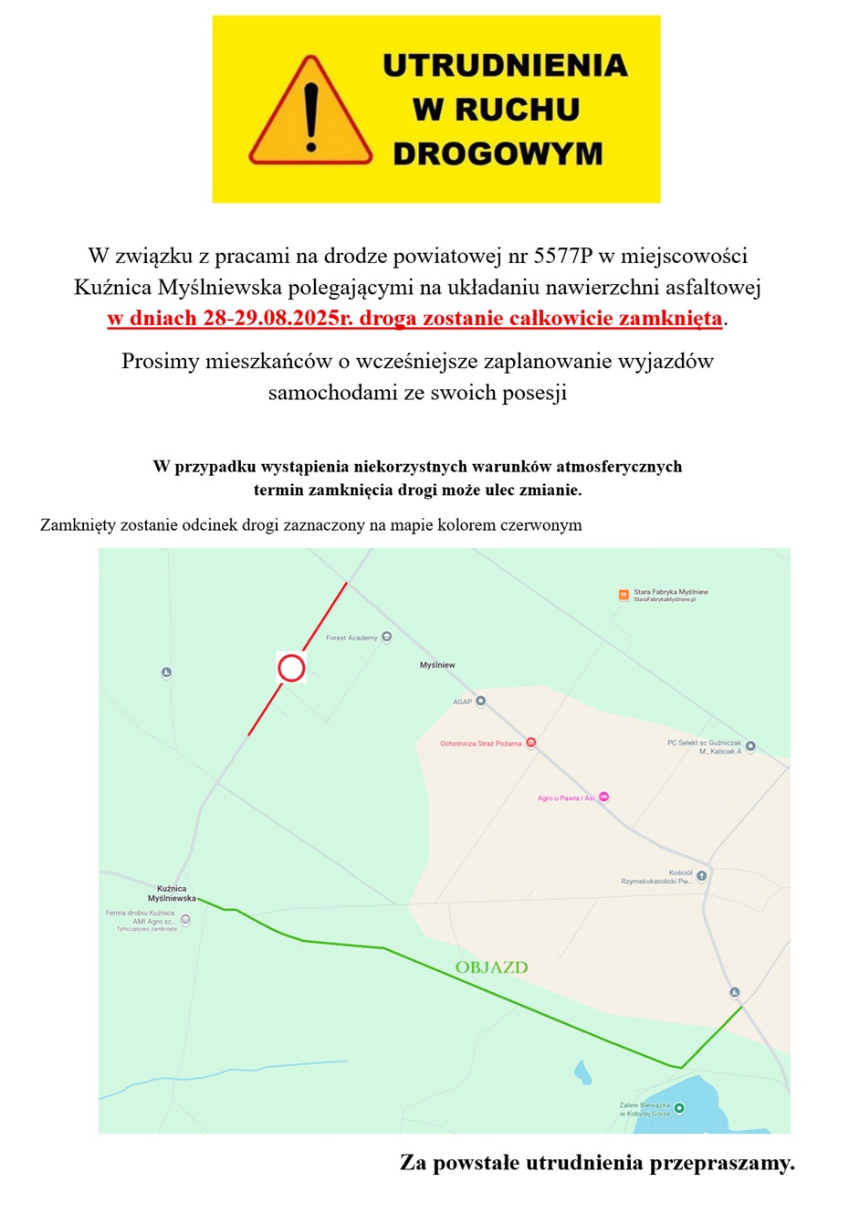 Uwaga, zamknięcie drogi w Kuźnicy Myślniewskiej!