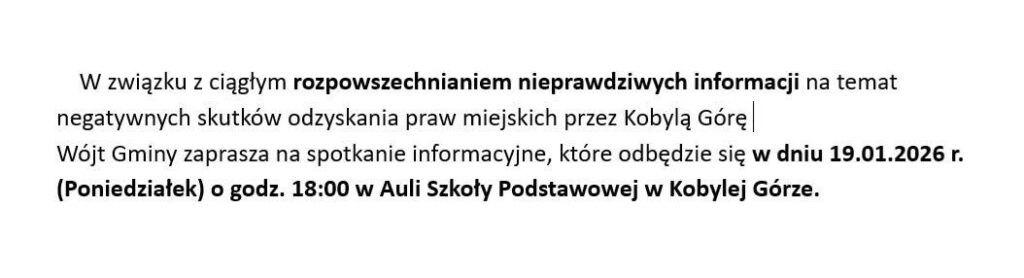 Temat budzi spore emocje. W sieci pojawiło się wielu przeciwników przywrócenia statusu miasta, a wraz z nimi – liczne pytania i wątpliwości. Aby wyjaśnić niejasności i uciąć krążące w internecie “nieprawdziwe informacje” dotyczące rzekomych negatywnych skutków zmiany, wójt gminy zaprasza mieszkańców na spotkanie informacyjne. Odbędzie się ono 19 stycznia o godz. 18 w auli Szkoły Podstawowej w Kobylej Górze.