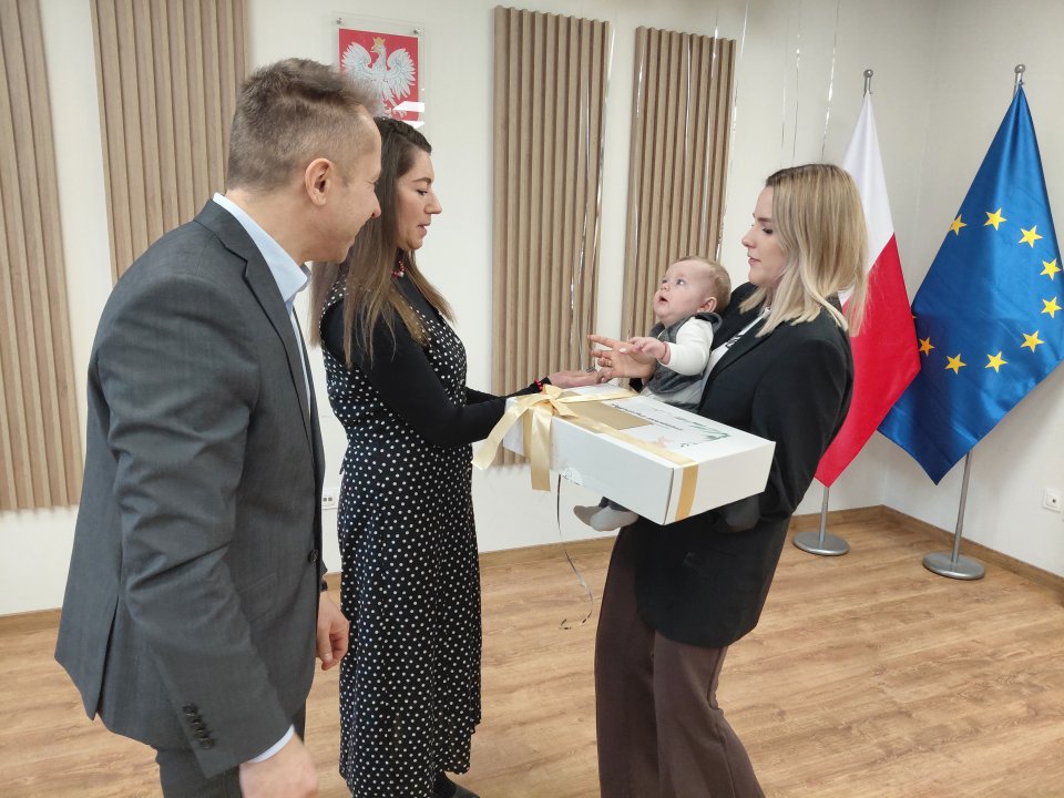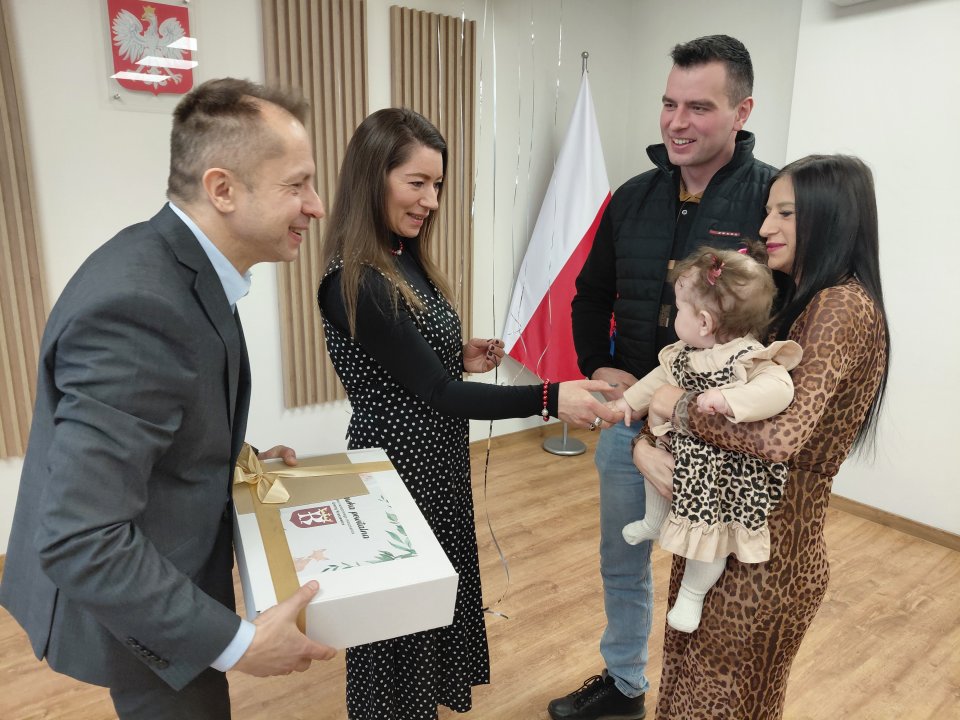 Zestawy powitalne, w imieniu wójt gminy Marty Pijanki, wręczyli sekretarz gminy Paweł Uścinowicz oraz kierownik Urzędu Stanu Cywilnego Paulina Gajdka. Podczas spotkania rodzice otrzymali także gratulacje oraz życzenia zdrowia i pomyślności dla swoich pociech.
