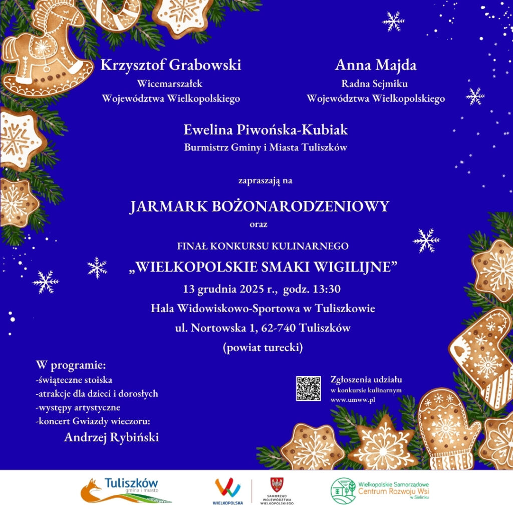 Samorząd Województwa Wielkopolskiego wspólnie z Gminą Tuliszków zaprasza na kolejną edycję Jarmarku Bożonarodzeniowego wraz z konkursem kulinarnym dla Kół Gospodyń Wiejskich „Wielkopolskie Smaki Wigilijne”. Jarmark odbędzie się 13 grudnia 2025 roku w Hali Sportowej przy ul. Nortowskiej 1 w Tuliszkowie, powiat turecki. Rozpoczęcie zaplanowano na godz. 13.30.